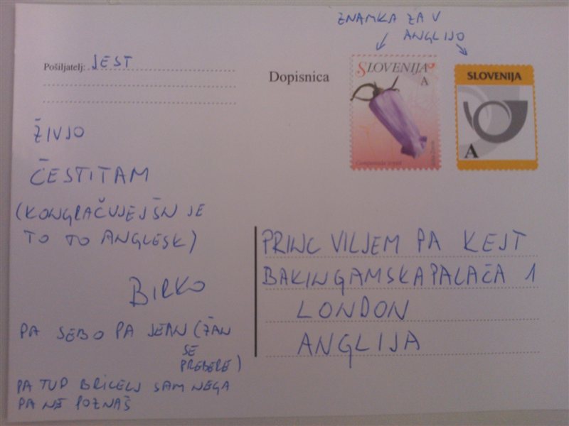Ker je zdj že tut znano ime malega princa kraljevega para, sm se odloču, da ob tej priložnosti še jest čestitam s prov posebno dopisnco, k sm jo poslal v "Bakinghamsko palačo". :)